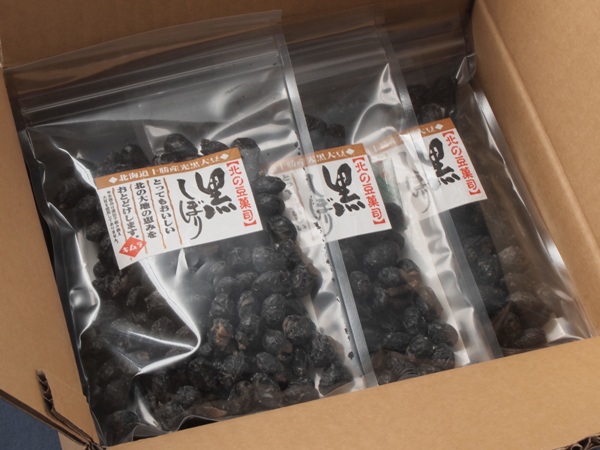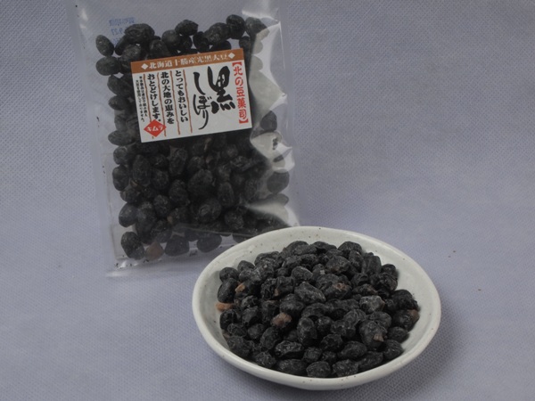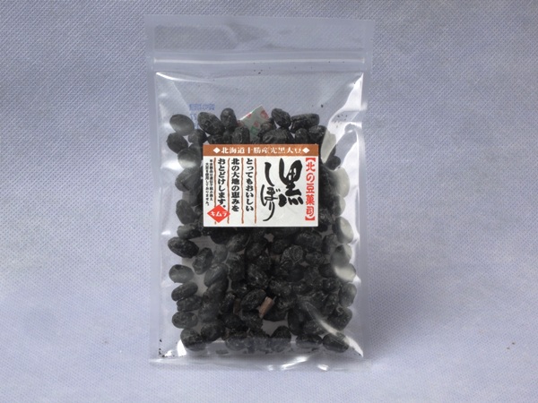 北海道十勝産の黒大豆「光黒大豆」をふっくらと炊き上げ、手間暇をかけてゆっくりと乾燥させて作った「甘さ控えめ」の甘納豆風のお菓子「黒しぼり」は、見た目は堅そうですが、黒豆自体が持つふっくらした食感と風味と甘さをおさえた優しい口当たりが特徴です。黒大豆と砂糖以外は添加物を一切使用していません。