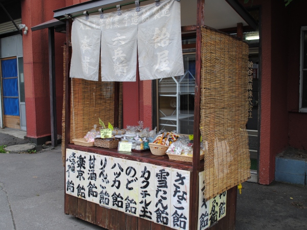 小樽の観光スポット、小樽運河の近くにある飴屋製菓の工場では、昭和の駄菓子屋を思わせる木製のワゴンで飴が販売されております。※悪天候時は事務所内にて販売